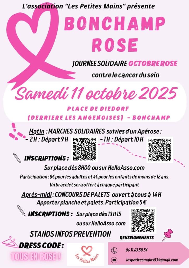 A noter : L’association “Les Petites Mains” organise une JOURNÉE SOLIDAIRE OCTOBRE ROSE contre le cancer du sein….. BONCHAMP ROSE demain Samedi 11 octobre 2025.