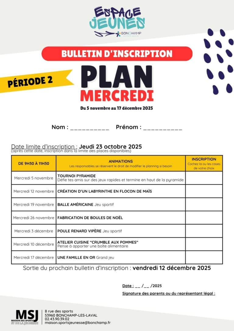 Actualitésde Bonchamp octobre 2025 13 octobre 2025 Une fresque en graff réalisée par 5 bonchampois 13 octobre 2025 Près de 2000€ récoltés lors de la journée solidaire Bonchamp rose 10 octobre 2025 Le programme du Plan Mercredi (réservé aux CM2) du 5 novembre au 17 décembre 2025 est disponible 10 octobre 2025 12 assistant(e)s maternel(le)s et 40 tout-petits marchent ensemble dans le cadre d’Octobre rose 10 octobre 2025 Les élèves du dispositif ULIS de l’école Bono Campo se sont rendus hier après midi au marché des producteurs locaux dans le cadre de la semaine du goût 9 octobre 2025 Des résidents de l’Ehpad Korian La Villa du Chêne découvrent l’exposition d’Emilia Rissel-Mardelé à la mairie 9 octobre 2025 Le Centre Communal d’Action Sociale recherche des bénévoles pour la collecte nationale de la banque alimentaire 7 octobre 2025 Un séjour en Dordogne sous le signe de la découverte, de la nature et de la préhistoire pour les CM1 et CM2 de Nazareth 6 octobre 2025 70 bénévoles investis pour la 4è édition de la Journée citoyenne samedi septembre 2025 30 septembre 2025 Bonchamp Rose et solidaire avec l’Association « Les Petites Mains » Navigation des articles 1 2 3