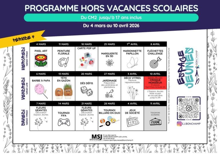 Actualitésde Bonchamp février 2026 27 février 2026 Des vacances de Février riches en animations pour nos jeunes bonchampois ! 26 février 2026 La liaison douce entre la mairie et les Angenoises prend forme 24 février 2026 Découvrez Le programme de l’Espace Jeunes du 4 mars au 10 avril 2026 13 février 2026 230 écoliers et 40 collégiens ont participé au Championnat départemental scolaire d’échecs aux Angenoises 11 février 2026 L’atelier patchwork de Familles Rurales fait un don de 251€ à l’association Citad’Elle 10 février 2026 👩🎨A découvrir Salle des Mariages à la mairie : 11 tableaux de l’artiste amateur Jérôme BREGER 3 février 2026 Restauration scolaire : Du FAIT MAISON – 6è Rdv décembre 2025 15 décembre 2025 Bonchamp obtient le label Ville Sportive des Pays de la Loire novembre 2025 14 novembre 2025 Le Relais Petite Enfance (RPE) est un lieu d’accueil, d’information et d’accompagnement septembre 2025 9 septembre 2025 Retrouvez vos commerçants de marché tous les jeudis de 15h30 à 19h Place de Diedorf (derrière les Angenoises) Navigation des articles 1 2 3