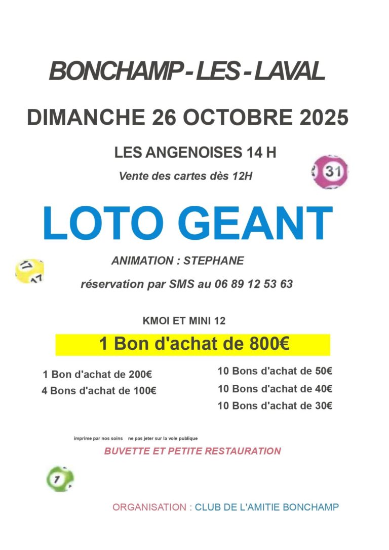 octobre 2025 23 octobre 2025 Don du sang 24 octobre 2025 « C’est décidé je deviens une connasse » la comédie phénomène fait son retour aux Angenoises 26 octobre 2025 Loto géant avec Générations Mouvement 31 octobre 2025 « La Vie en rose » Les 160 choristes de Coup d’Chœur présentent leur nouveau spectacle en chansons novembre 2025 1 novembre 2025 Evènements Padel : Tournois, Découverte Padel jeunes et Stages Padel adultes 2 novembre 2025 « La Vie en rose » Les 160 choristes de Coup d’Chœur présentent leur nouveau spectacle en chansons 5 novembre 2025 Temps du conte à la médiathèque 6 novembre 2025 Conseil municipal 13 novembre 2025 Repas des Ainés aux Angenoises : Inscriptions avant le 31 octobre 2025 14 novembre 2025 Familles Rurales de Bonchamp et le Cercle généalogique de la Mayenne vous invitent à une réunion sur la Généalogie familiale Navigation des articles 1 2