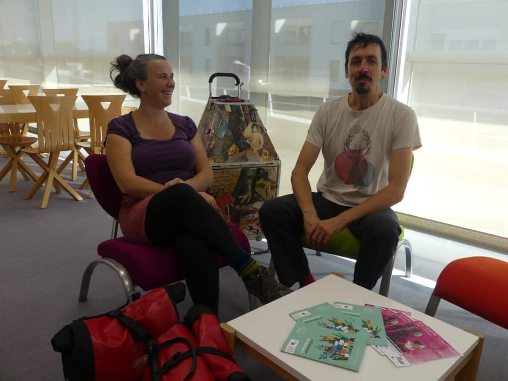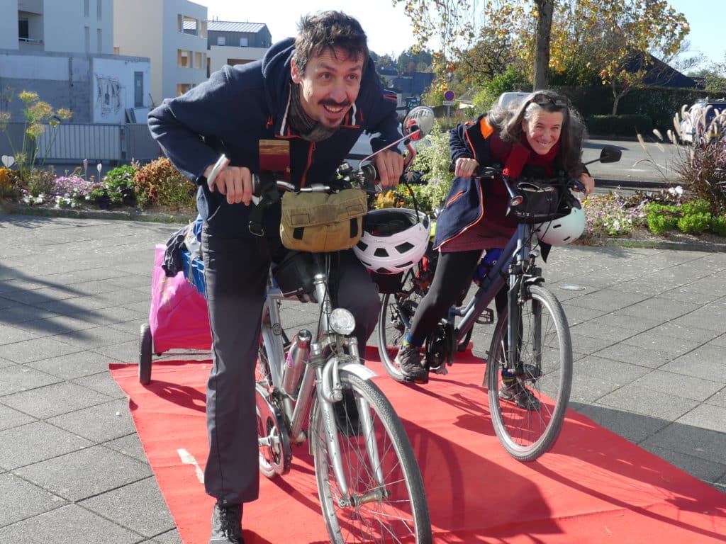 Bretelle & Garance sont arrivés aux Angenoises ce midi à Bib’cyclette. Partis de Louverné, ils ont été accueillis par l’équipe de la Médiathèque et de Jean-Pierre Teulade, Responsable des Angenoises, pour jouer leur spectacle « La Part des Choses » qui affiche Complet demain soir