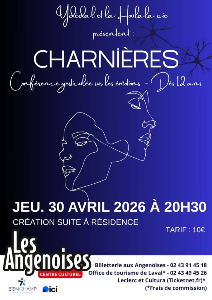 Et si on faisait une pause ? Un vrai temps d’arrêt pour écouter ce qui se passe à l’intérieur. Nous dialoguons sans cesse avec une petite voix dans notre tête — parfois guide bienveillant, parfois juge encombrant. Charnières est une conférence gesticulée qui explore ce monde intime des émotions : comment elles surgissent, ce qu’elles provoquent, et comment elles peuvent nous submerger si on ne les comprend pas. À travers trois femmes à des moments clés de leur vie — l’entrée dans la vie active, la traversée du milieu de vie, et l’arrivée en EHPAD — le spectacle mêle récits personnels, humour et réflexions sensibles. Une invitation à mieux comprendre nos états intérieurs, pour apprendre à vivre avec, plutôt que de lutter contre.