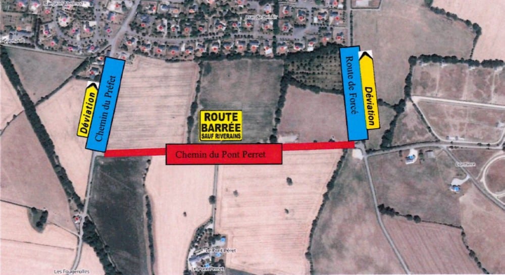 La route sera barrée et la circulation interdite sur cette dite route pendant les travaux. Cette disposition ne s’applique pas aux riverains et aux véhicules des services de secours. Pendant la période de travaux, la circulation sera déviée par la route de Forcé et la route du Chemin du Préfet.