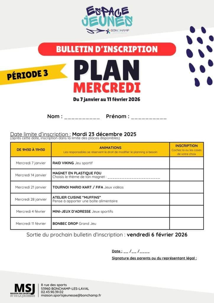 Tous les mercredis matins de 9h30 à 11h30 (hors vacances scolaires) l’Espace Jeunes propose des animations gratuites pour les enfants scolarisés en CM2 à Bonchamp (sports, activités manuelles, ateliers cuisine…)
