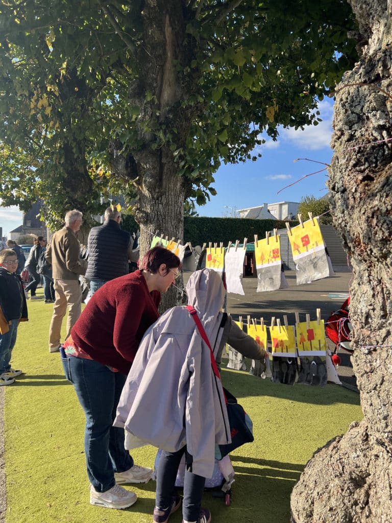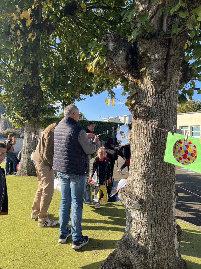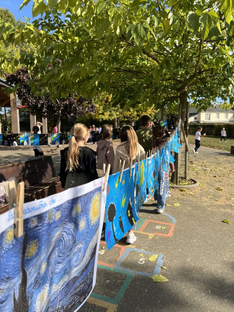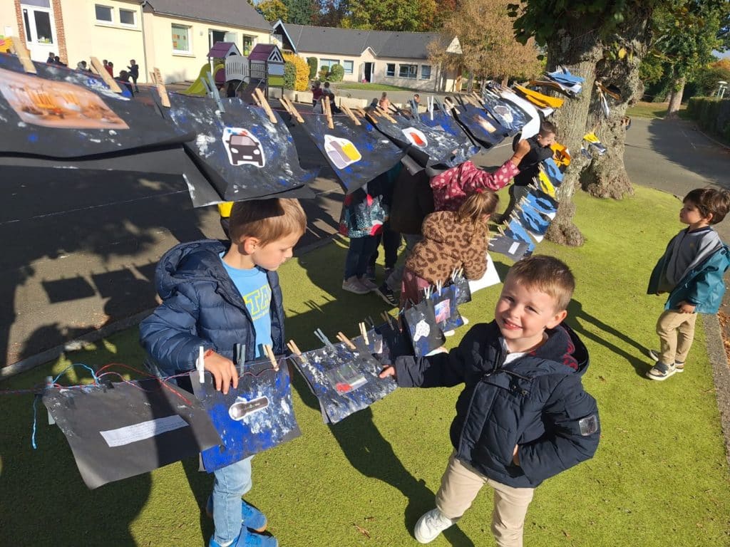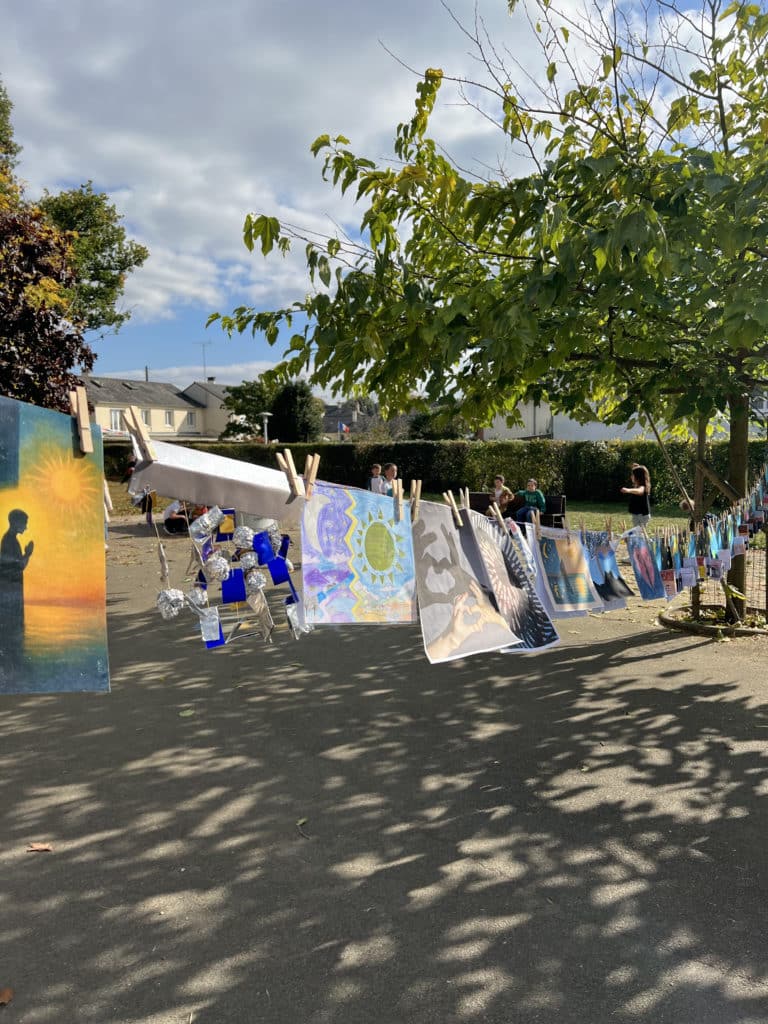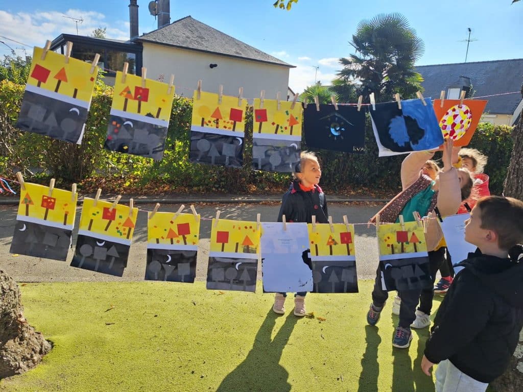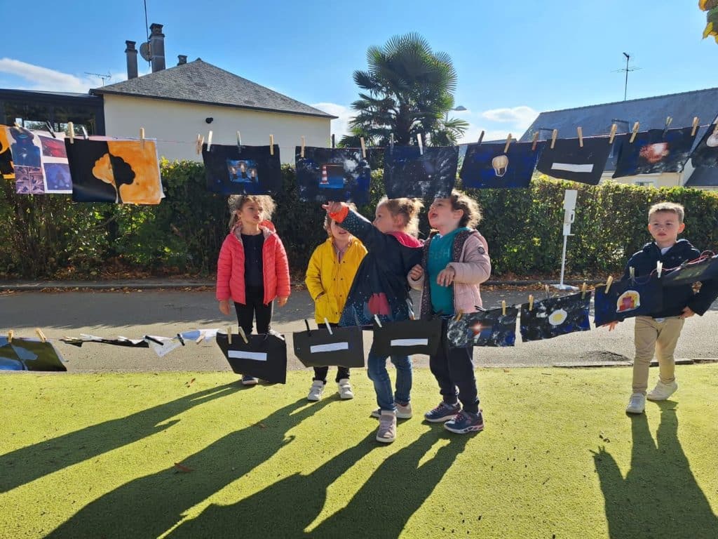 Dans la cour de l’école, des fils ont été tendus comme des cordes à linge, et chaque élève y a suspendu sa création : dessins, collages, peintures… autant d’œuvres originales réalisées autour du thème proposé cette année, « nuit, jour : réfléchir la lumière ».