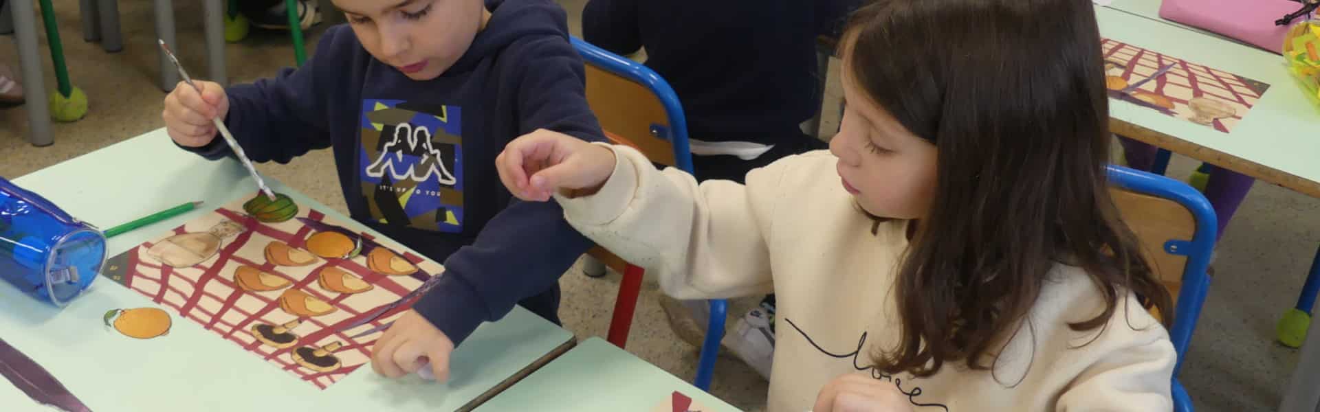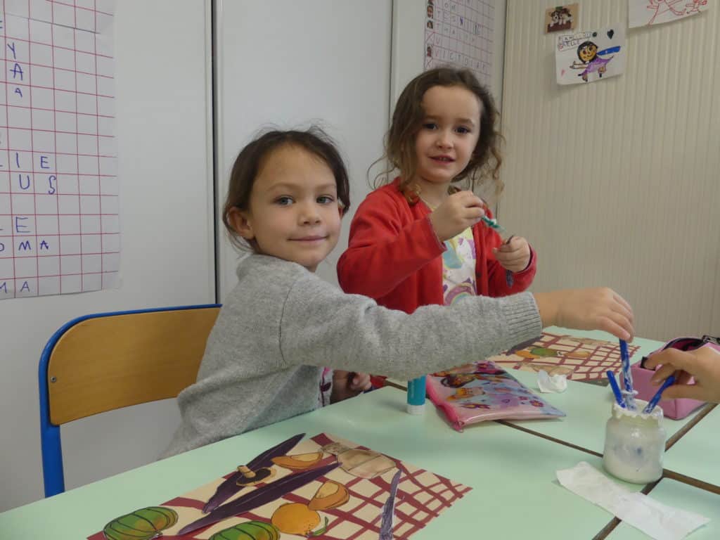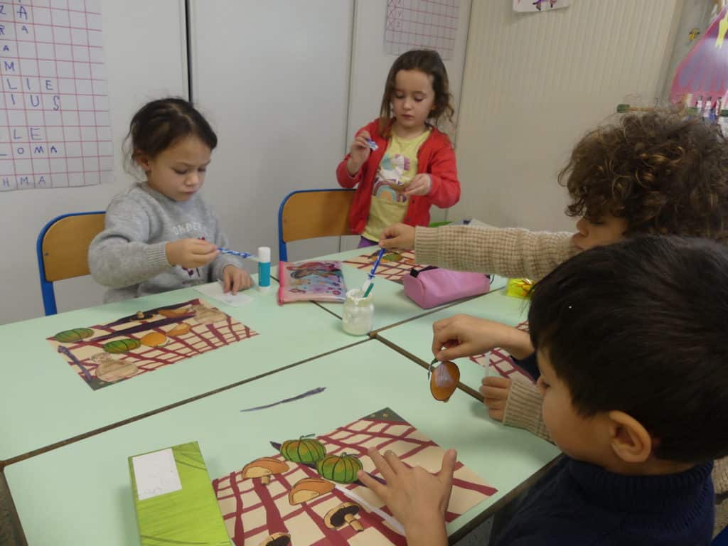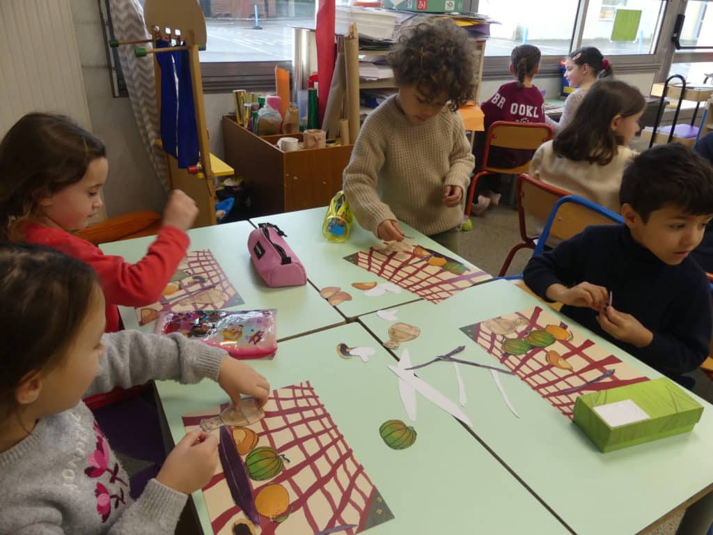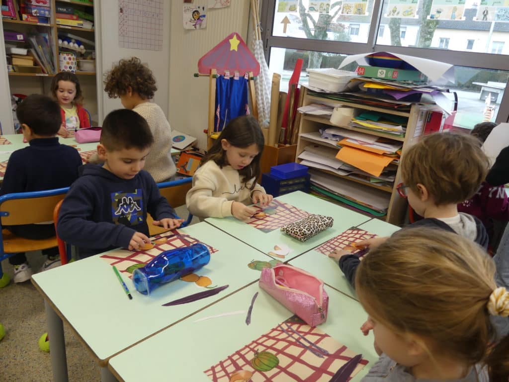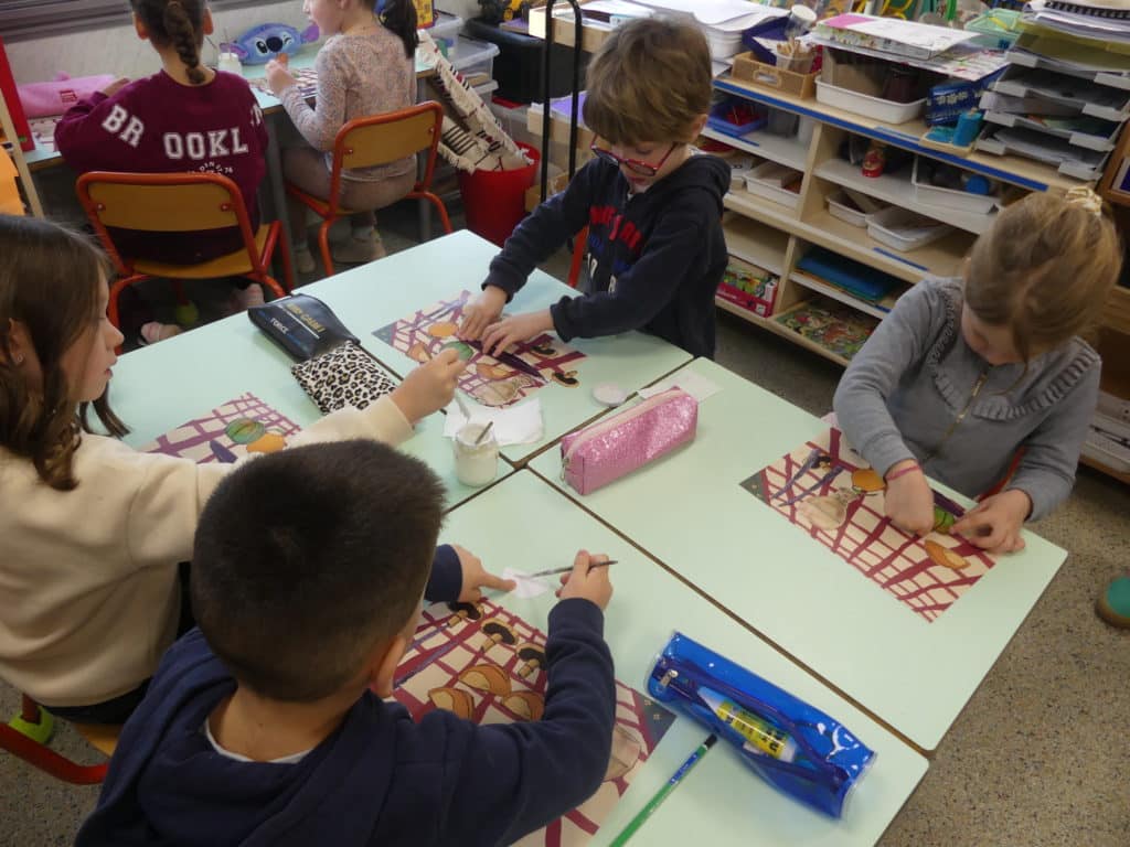 Le thème « Papilles et pupilles » choisi par l’enseignante rentre dans un parcours artistique et culturel avec les arts visuels ; ce qui a permis aux élèves de créer leur composition personnalisée d’une table de pique-nique en collant des fruits et légumes, du pain, de placer les couverts sur une nappe à carreaux en papier.