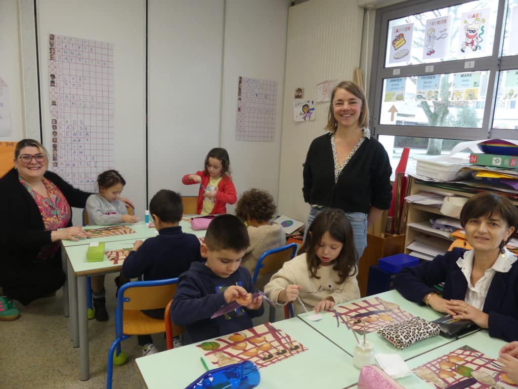 Rahma Ouaddour (à gauche), ATSEM, Juliette Maharaux (debout), médiatrice culturelle intervenante et Gaëlle Ollivier (à droite), enseignante, avec ses élèves de moyennes et grandes sections de maternelle, pendant la création personnalisée d’une table de pique-nique