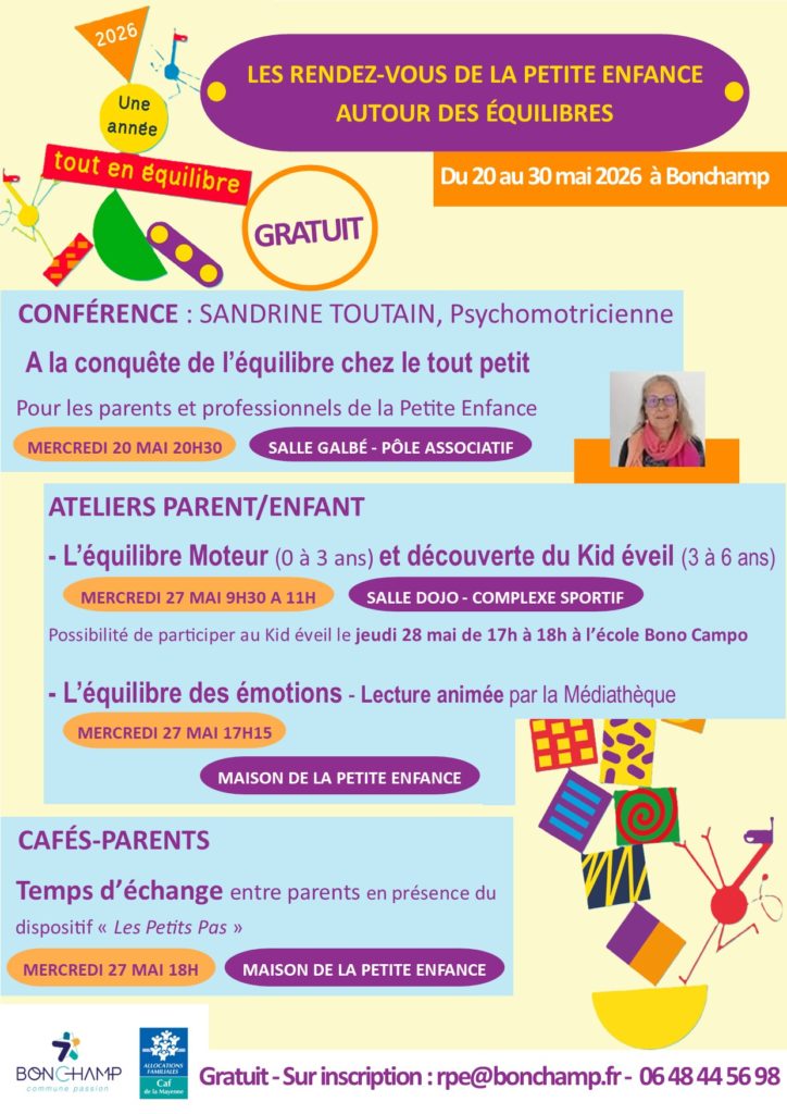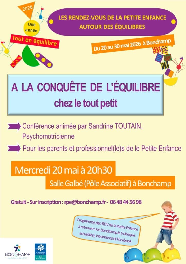 Un des temps fort sera l’intervention de Sandrine Toutain, psychomotricienne avec une conférence « A la conquête de l’équilibre chez le tout petit » le mercredi 20 mai à 20h30 Salle Galbé au Pôle Associatif pour les parents et les professsionnel(le)s de la Petite Enfance. Cette intervention aura pour objectif d’apporter des connaissances sur le développement du jeune enfant (0 à 3 ans).
