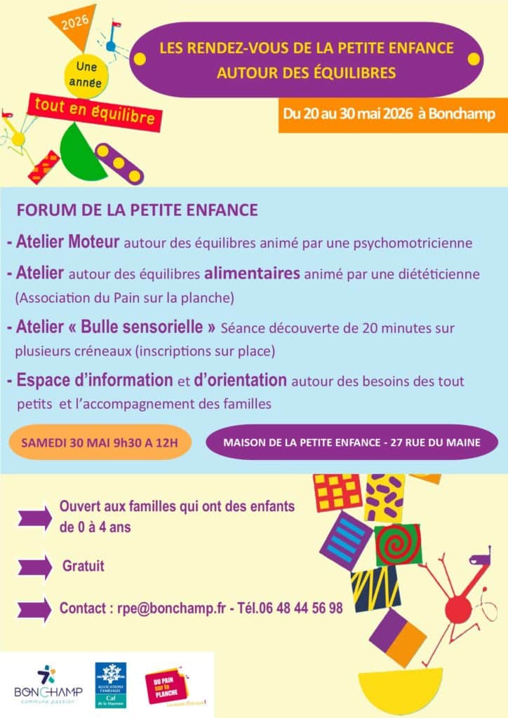 Inscriptions auprès du RPE – Tél. 06 48 44 56 98 – mail : rpe@bonchamp.fr