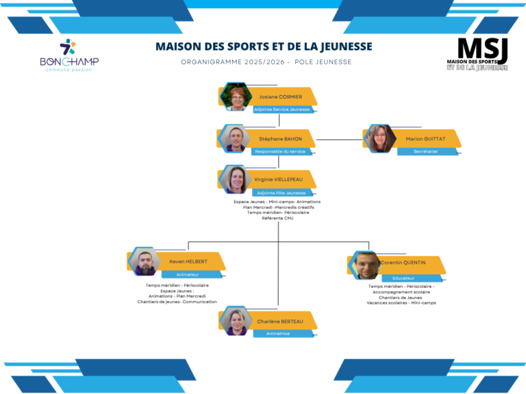 Pôle Jeunesse Mairie de Bonchamp-lès-Laval / MA FAMILLE / JEUNESSE / Maison des Sports et de la Jeunesse / Pôle Jeunesse Espace Jeunes Chantiers Citoyens Relais Info Jeunes Adjointe Pôle Jeunesse : Virginie VIELLEPEAU Courriel : responsable.jeunesse@bonchamp.fr Consulter l’organigramme du Pôle Jeunesse