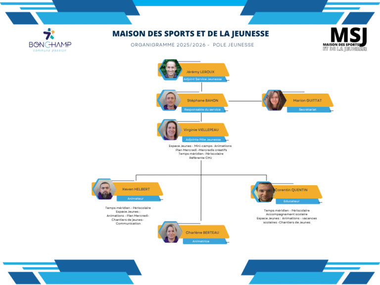 Pôle Jeunesse Mairie de Bonchamp-lès-Laval / MA FAMILLE / JEUNESSE / Maison des Sports et de la Jeunesse / Pôle Jeunesse Espace Jeunes Chantiers Citoyens Relais Info Jeunes Adjointe Pôle Jeunesse : Virginie VIELLEPEAU Courriel : responsable.jeunesse@bonchamp.fr Consulter l’organigramme du Pôle Jeunesse