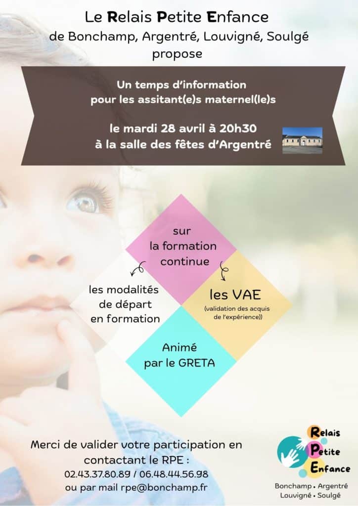 Relais Petite Enfance – Maison de la Petite Enfance – 27 rue du Maine – 06 48 44 56 98 – rpe@bonchamp.fr
